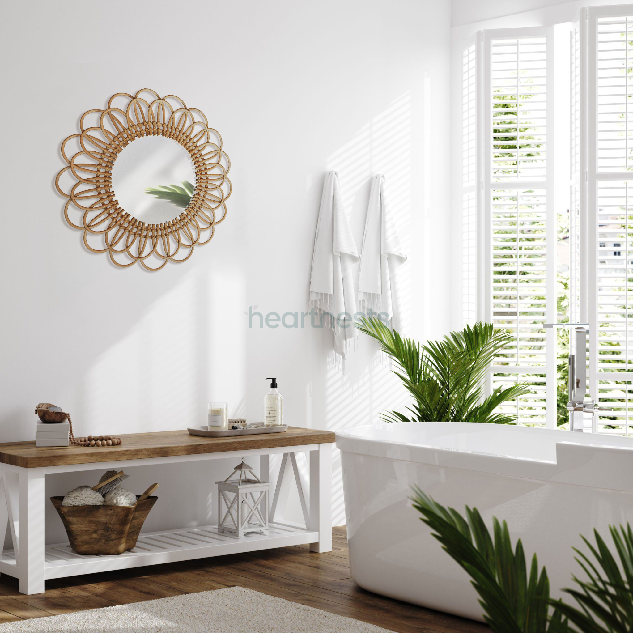 Elevate your home with the Flora Rattan Mirror Wall Decor. This stunning rattan mirror is intricately formed in a flower shape, adding a touch of exotic style to your living space. Crafted with precision and care, it is the perfect way to add a unique aesthetic to any room.