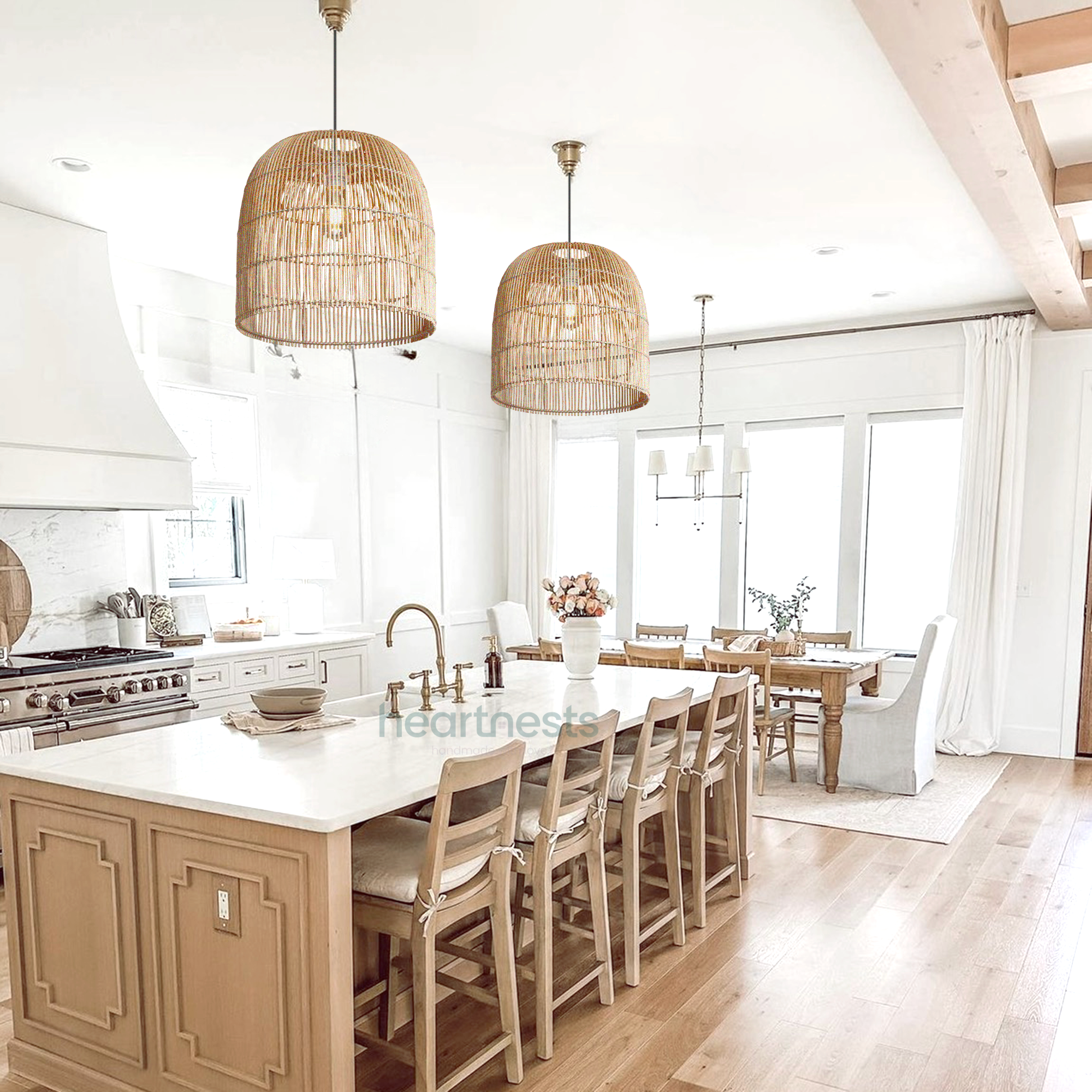 This beautiful piece is handmade with love and care by local Vietnamese artisans. Organic rattan is skillfully woven onto sturdy metal frame using traditional weaving techniques providing such a special work of art which has never gone out of favour. This pendant light once shines, will add a sense of story to the existing elements of your rooms. It looks great in variety of different home decoration settings, from contemporary to Boho, minimalistic, Scandinavian, Hampton or coastal styles. Whether it is domestic or commercial use in an industrial space, a beach house, a vacation home or Airbnb rentals, it won't disappoint you. The options are endless.